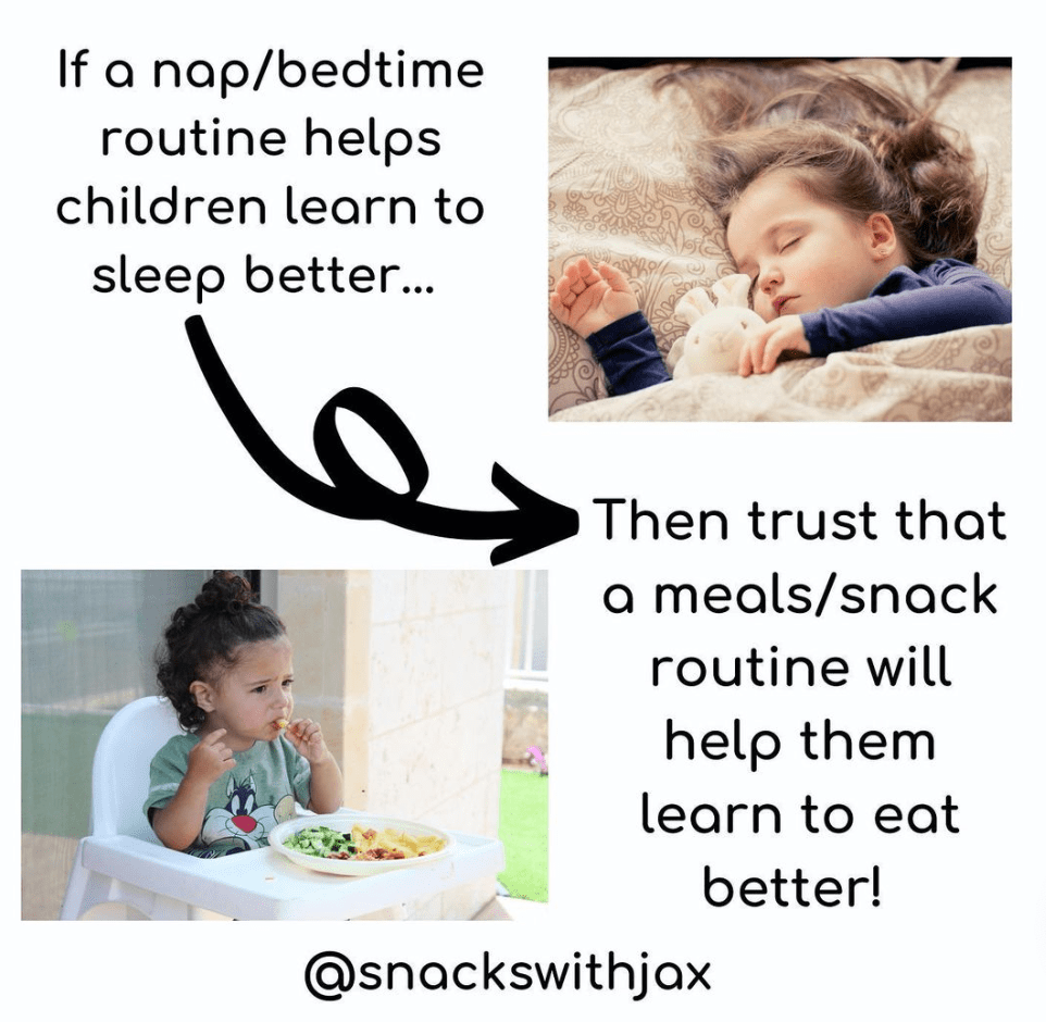 So trust that just like your nap/bedtime routine, your child will thrive best with a predictable and consistent meal/snack routine ❤️ you can even incorporate “before meal rituals” – similar to your typical bath, brush teeth, & story before bed- to help your child transition from playing to sitting at the table!
