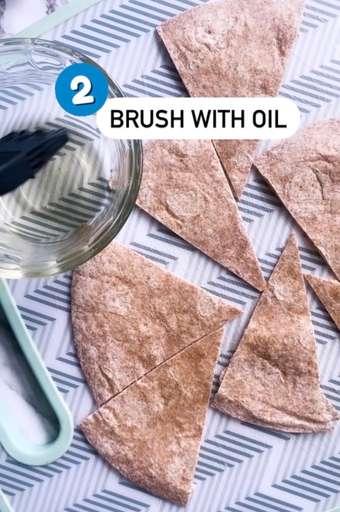 - Brush your tortilla slices on both sides lightly with the oil of your choice